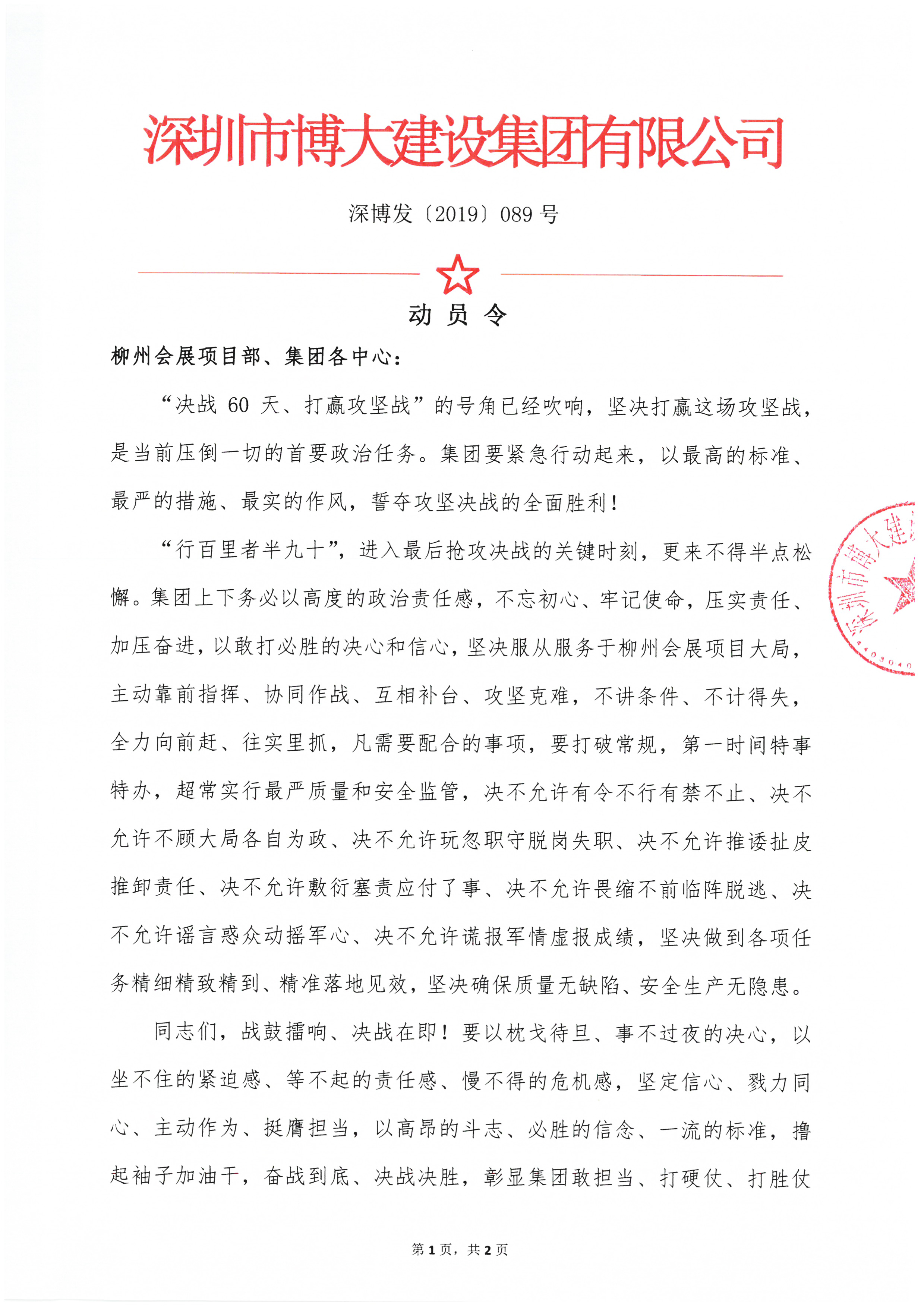 中國-東盟(柳州)工業品展示交易中心二三期(會展中心)項目工地現場宣誓聲響徹云霄。11月1日上午,柳州會展二、三期項目共同召開確保“12?30”節點目標誓師動員大會,博大建設集團作為重要參建單位,集團董事、副董事長黃河親臨現場,與甲方簽訂“軍令狀”。