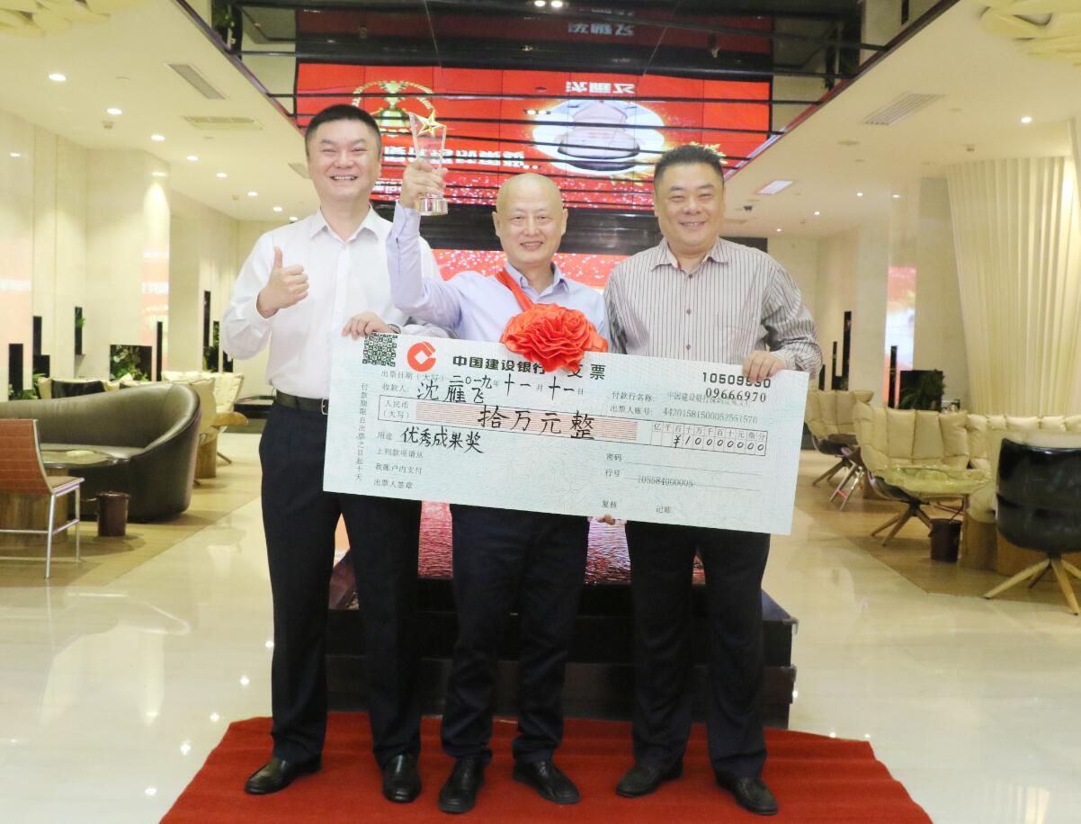 集團常務副總裁沈雁飛在集團業務拓展中做出突出貢獻,被授予優秀成果獎,獎勵10萬元。圖為徐凱宏董事長、黃河副董事長與獲獎者合影留念。