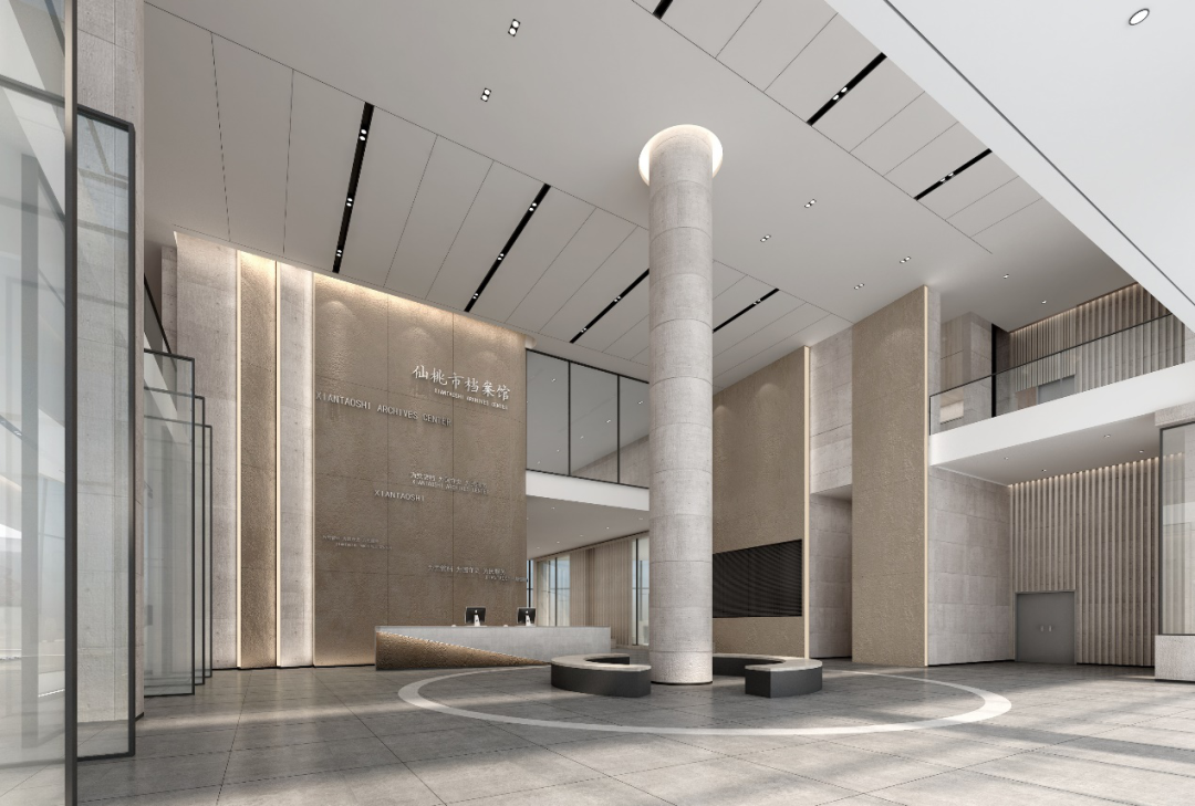 主背景墻設(shè)計(jì)靈感源于“紙張”“書(shū)本”,以大塊暖色文化石相互疊加,形成錯(cuò)層。在“紙張”之上點(diǎn)綴文字。記載著仙桃市檔案館的宗旨和重要時(shí)刻。整體設(shè)計(jì)更加符合“檔案”理念。