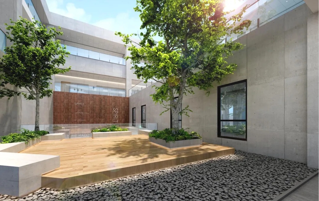 在滿是陽(yáng)光的露臺(tái)上,學(xué)員可以開(kāi)展一些戶外的活動(dòng),所以在布局上需要一塊相對(duì)開(kāi)場(chǎng)的區(qū)域,周邊利用花壇結(jié)合著座椅,做一些功能性的布置。