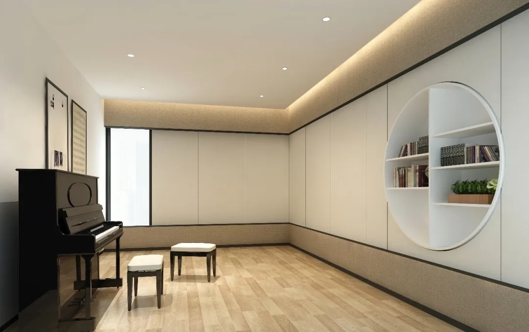 琴房的設(shè)計(jì)上,墻面采用一些卡其色的亞麻質(zhì)感的壁布,烘托一下整體空間的氛圍,讓空間光影的色性上更加柔和,墻上如畫卷展開(kāi)的造型,體現(xiàn)整體空間的人文特質(zhì)。