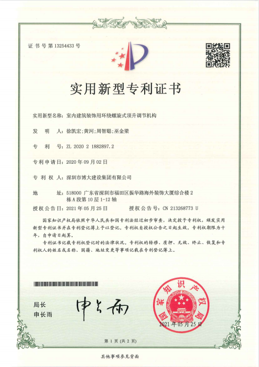 專利成果分別是《室內建筑裝飾用環(huán)繞螺旋式頂升調節(jié)機構》、《一種GRG吊頂安裝結構》、《一種PC預制混凝土構件下的特大推拉窗》、《一種帶有支撐構件的超大空間頂轉換層結構》、《一種單元拼接式鋁板吊頂或裝飾線條》等22項獲得由國家知識產權局頒發(fā)的專利證書。